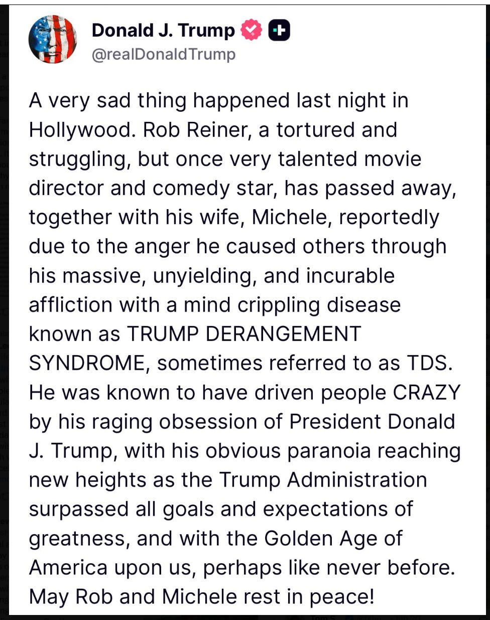 Yesterday, December 14, 2025, a man and his wife were stabbed to death in their California home by their troubled son. Shortly thereafter, our President reacted to the news on his social network: