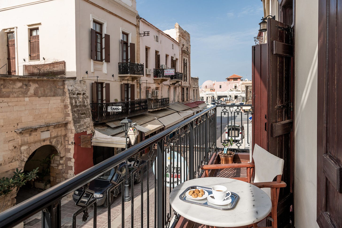 I intend to spend a good bit of my mornings on the balcony above, mostly making breakfast there in the apartment and throwing back a few cups of Joe whilst the locals go about their business. I will wave and say “Kalimera” to friendly sorts.
