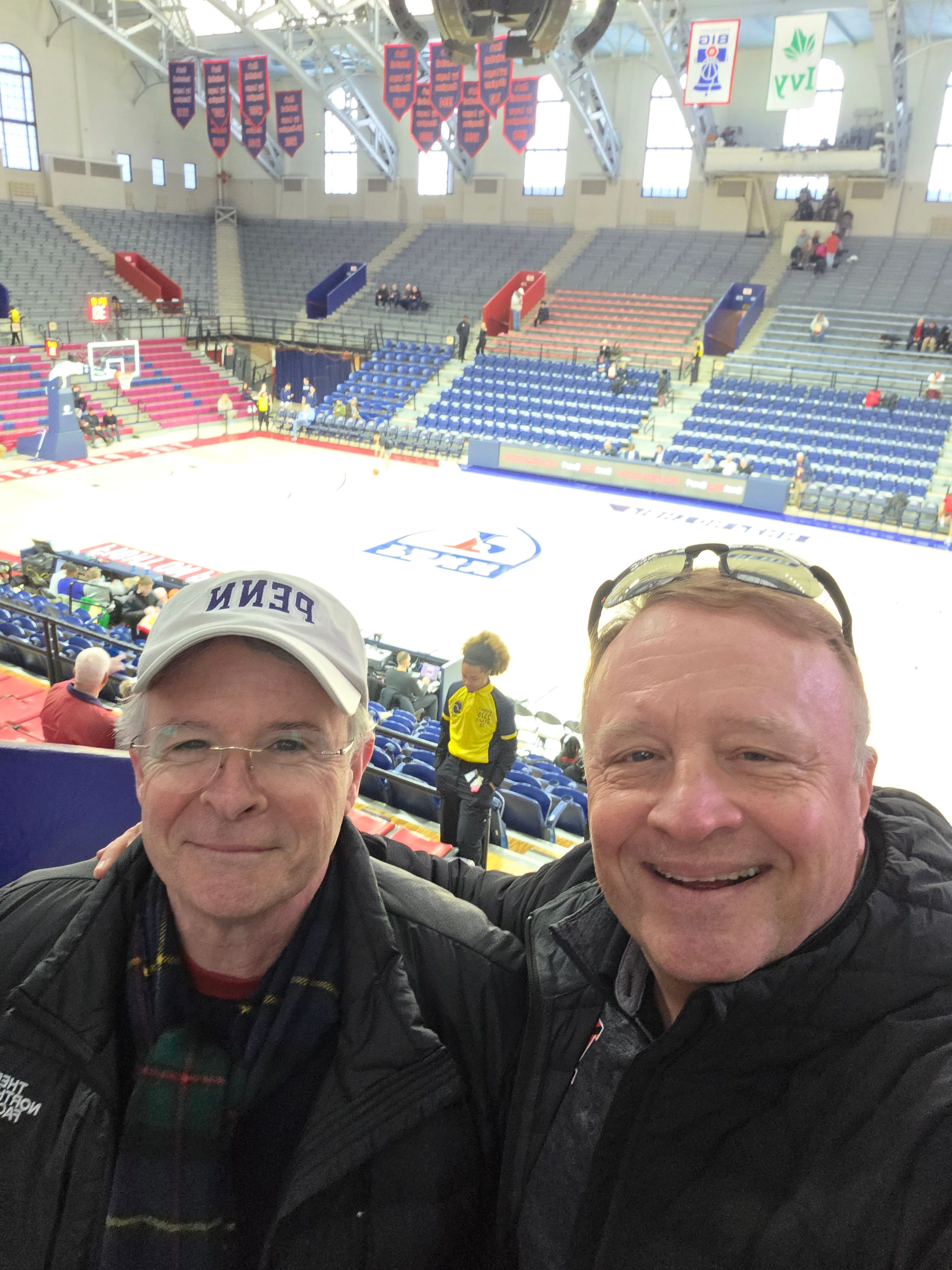 Todd retired from HIS second career a year and a half ago, and somewhere along the line, we cooked up the idea that we would one day road trip around the country and watch college basketball in all the generally acknowledged shrines to the sport. We beta-tested the idea this week, catching the Princeton v. Penn (all time series tied now at 128 games each) game at “The Palestra", which modestly refers to itself as the “cathedral" of college basketball. Todd is a Princeton grad, and Catherine is a Penn grad (hence, the lid).